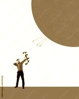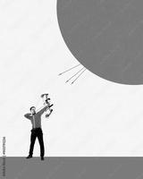 Businessman using archery in direction of abstract target. Precision and focus and achieving goals, strategic aiming, skills. Contemporary art collage. Concept of business, innovation and strategy