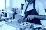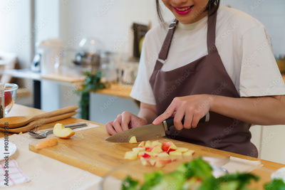 Closeup hands of asian women using knife to chopping slices apple on cutting board to preparing fruits of ingredients for cooking breakfast meal and salad while making healthy food lifestyle in home