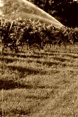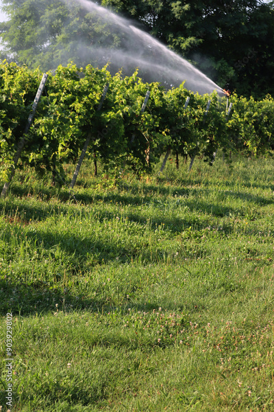 Water irrigation system in function on a green Pinot vineyard against sunlight on summer in italy