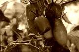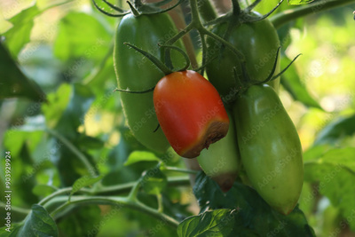 Ripe and unripe tomatoes with Apical rot disease on plant in the vegetable garden on summer