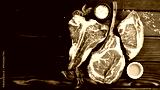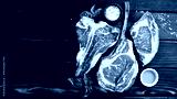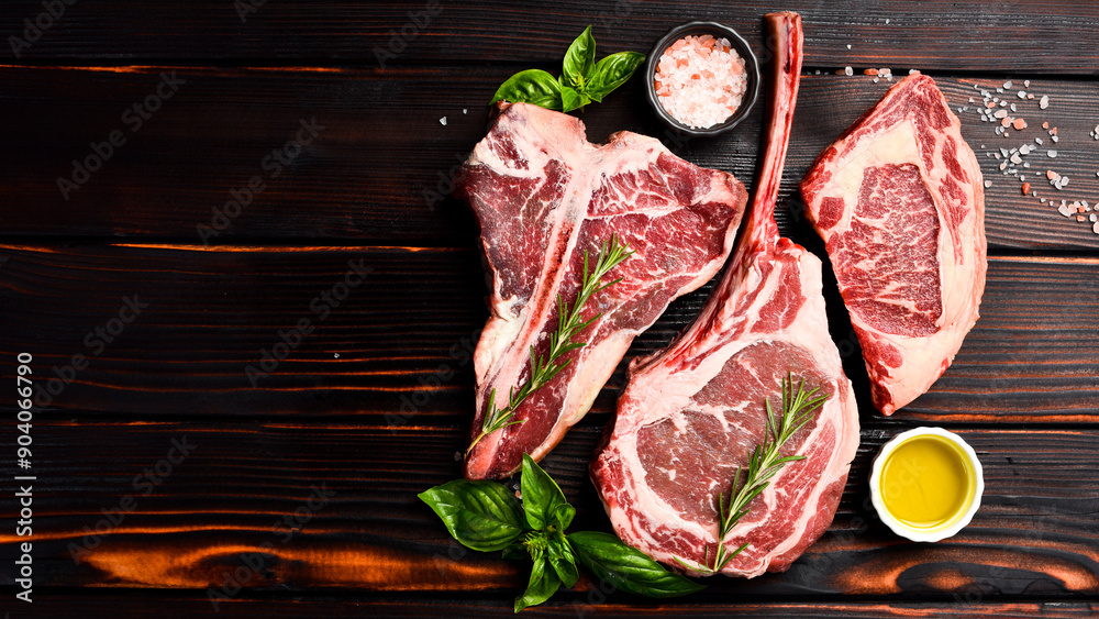 Variety of raw beef meat steaks for grilling with seasoning: Tomahawk steak, Ribeye, Ossobuco and T-bone steak, on a wooden brown background.