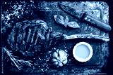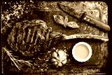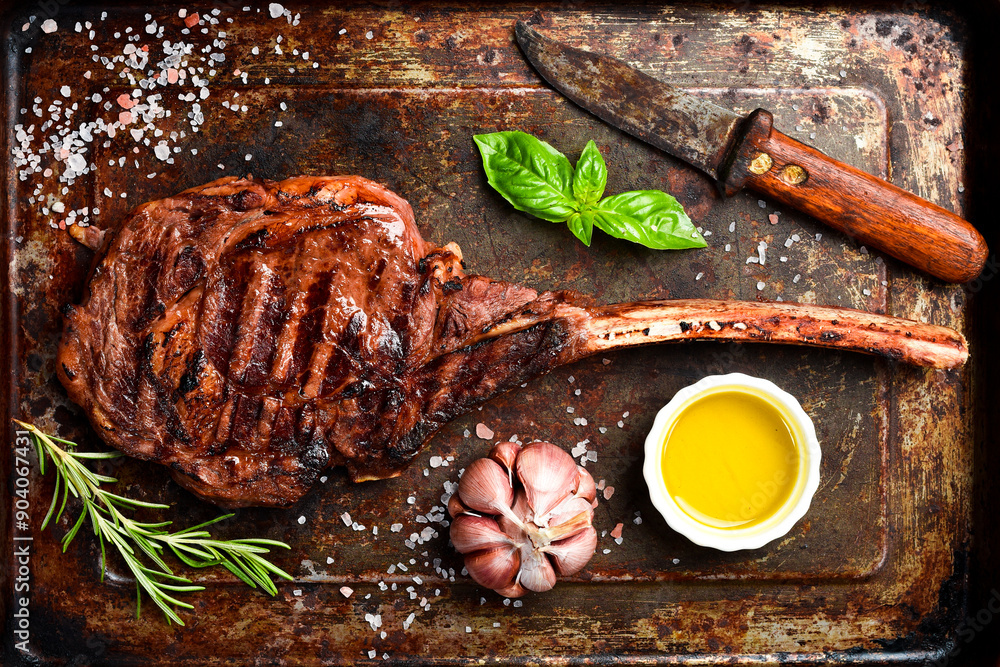 Steak on the bone. Grilled Tomahawk steak with rosemary and spices on a metal plate. Top view.