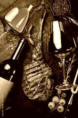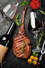 Bottled wine, glasses and Beef Tomahawk steak. Prime Black Angus beef steak and aged wine. Top view.
