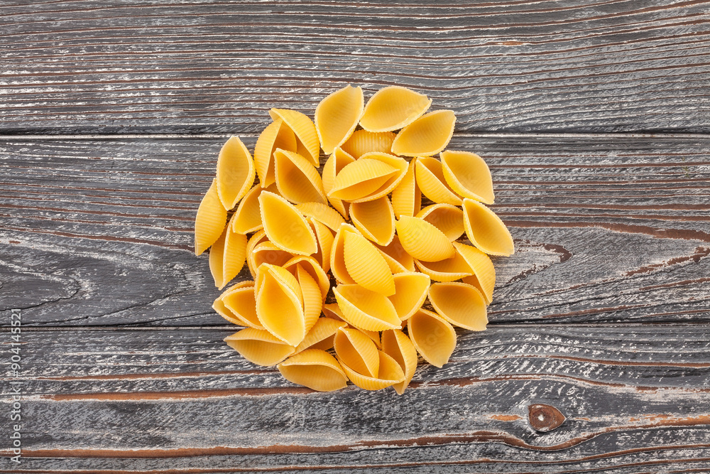 pasta conchiglie on wood background top view