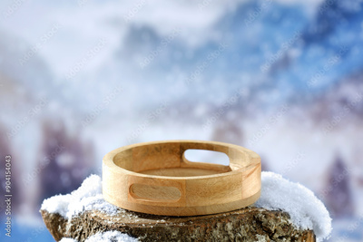 Wooden tray on wooden trunk with copy space for products. Blurred background of snowy forest and trees in snowy winter. Snow falling