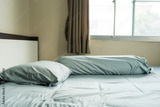 Comfortable blue bed with one pillows and one bolsters next to window. The concept of single and alone