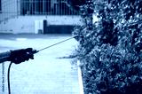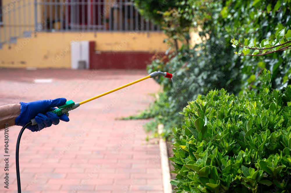 Close-up of a hand spraying pesticide on green bushes in a garden