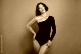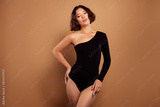 Photo of provocative sexual lady wear off shoulder black body suit empty space isolated beige color background