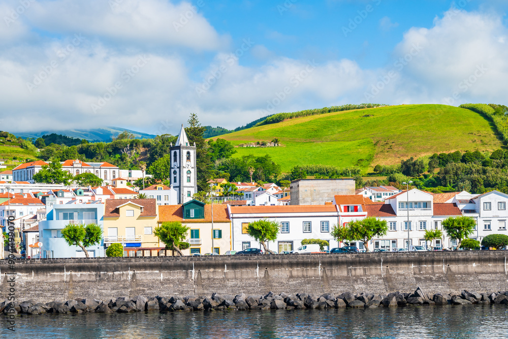 View of Horta port with town buildings and coastal promenade, Faial island, Azores, Portugal