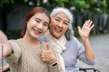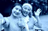 A lovely Asian granddaughter and a happy retired grandma are sitting together on a bench in a park.