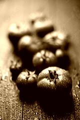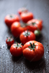 Ripe red tomatoes with water drops on rustic wooden table close up. Food photography