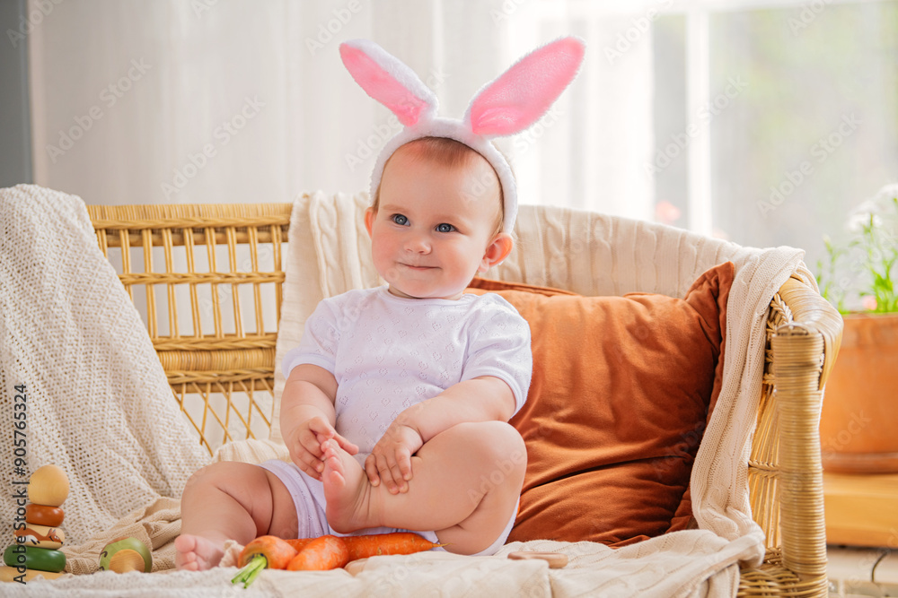 A child in a white cap with bunny ears sits on the sofa with a carrot in his hand.