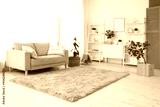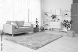 Interior of light living room with sofa, shelf units and sunflowers in vase