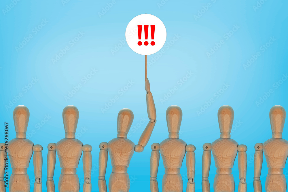 A wooden puppet doll marionette holding protest sign. Concept of emotional manipulation, world conspiracy theories., control and dictatorship.