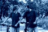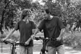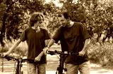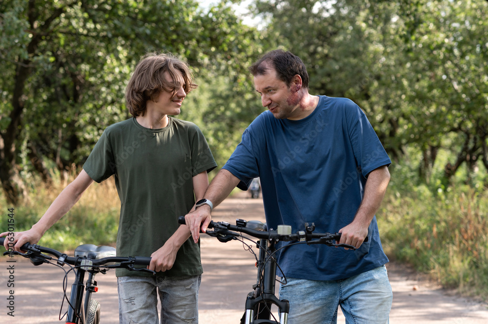 Happy smiling father and teenager son talking and walking together with bicycles outdoor