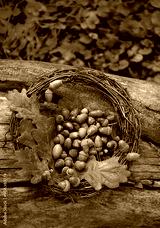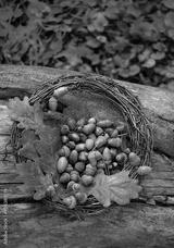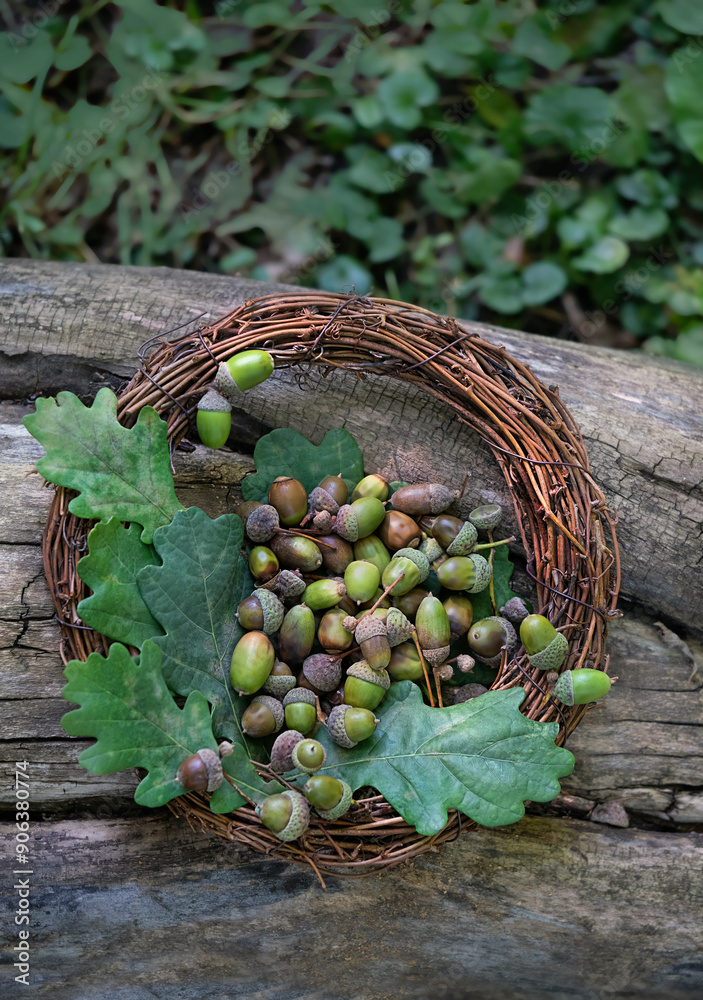 Unripe green acorns, oak leaves and wreath of branches on tree trunk, natural abstract background. forest harvest. top view