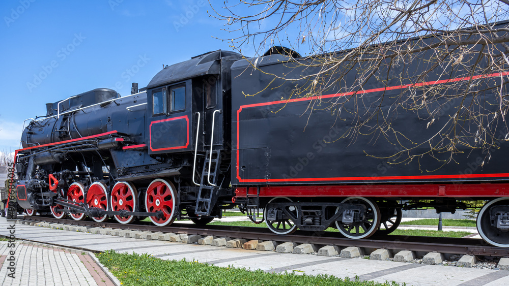 A large mainline passenger steam locomotive. Ancient railway transport. Transportation of goods by rail. A coal-fired steam locomotive.