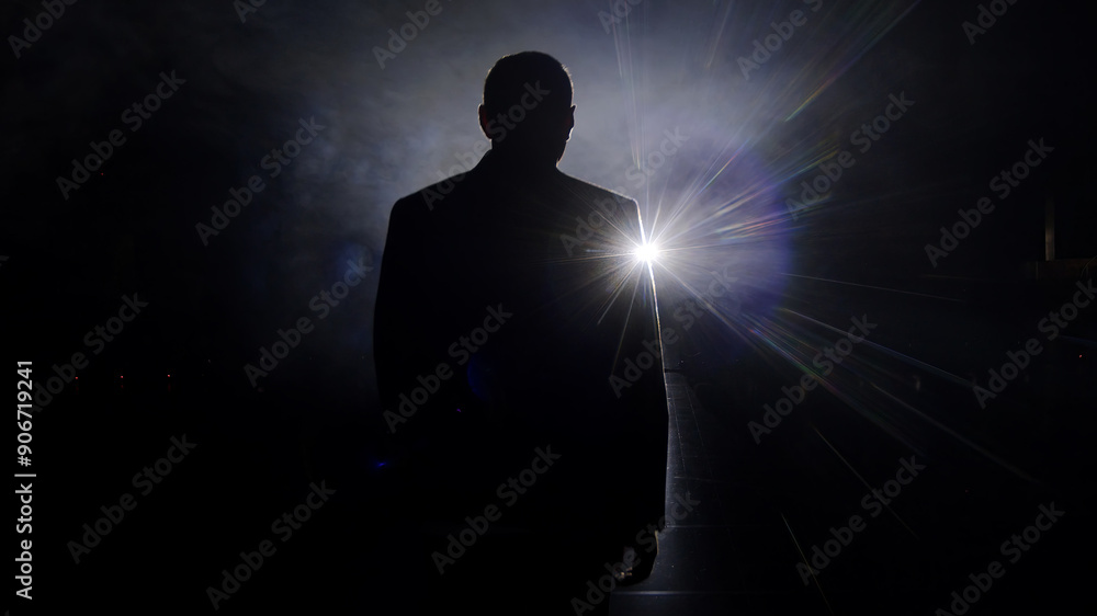 Silhouette of a man in classic suit against a backlight. A sophisticated and elegant image ideal for highlighting professionalism, formal events, and stylish fashion.