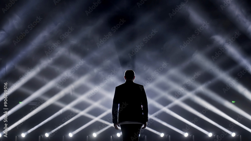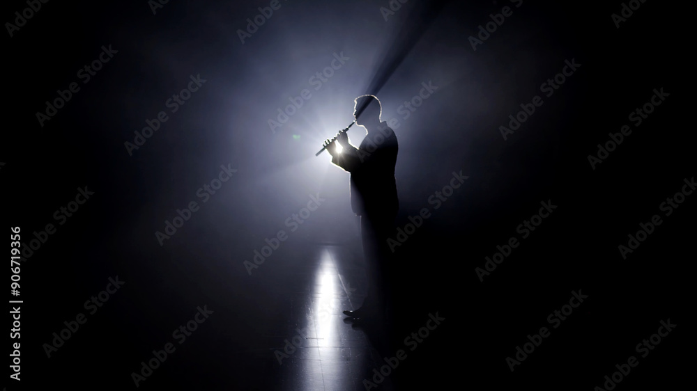 Silhouette of a man with a horn under stage lights. A striking image perfect for promoting live performances, musical events, and dramatic stage moments.