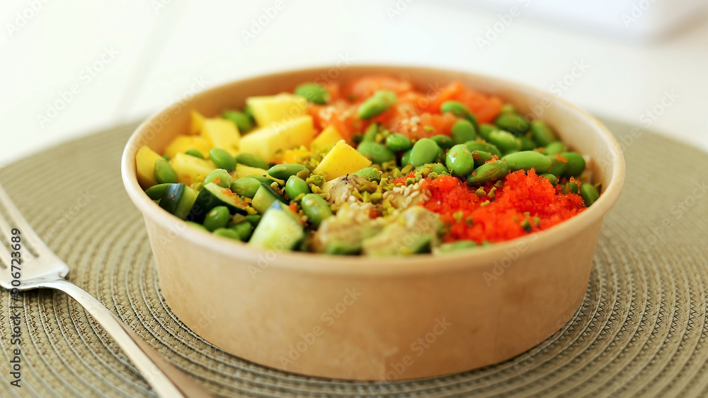 Traditional Hawaiian poke salmon served in a cardboard box. Fresh and flavorful, this popular dish offers a taste of the islands, perfect for a quick and delicious meal.