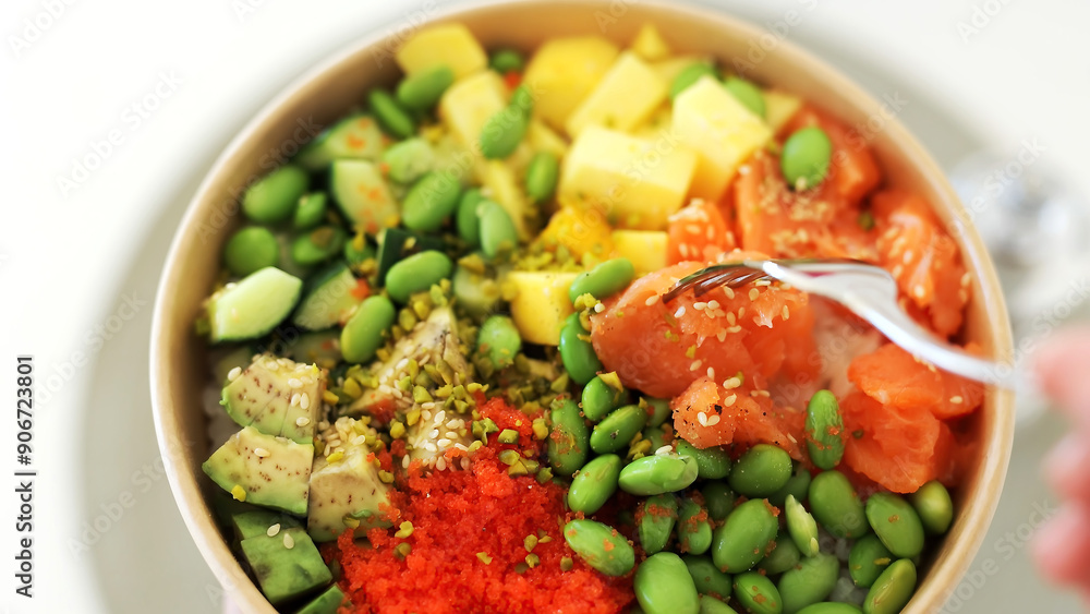 Traditional Hawaiian poke salmon served in a cardboard box. Fresh and flavorful, this popular dish offers a taste of the islands, perfect for a quick and delicious meal.