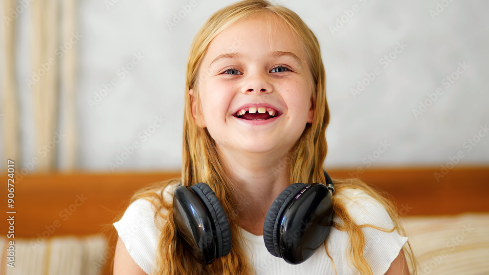 Close-up of a little girl enjoying her headphones while having fun at home. A delightful scene showcasing the joy of childhood and modern entertainment, perfect for family and lifestyle themes.