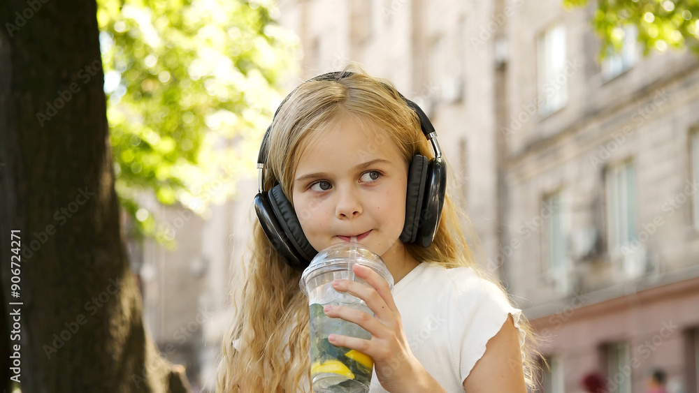 Little girl outdoors wearing wireless headphones, listening to music and enjoying a refreshing drink. A joyful scene perfect for highlighting summer fun, modern technology, and outdoor leisure.