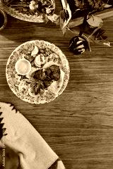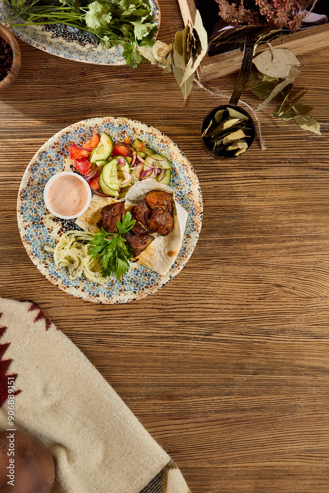 Grilled Meat Skewers with Vegetables and Onions on Rustic Wooden Table