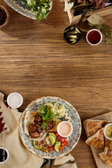 Grilled Shashlik with Vegetables and Onions on Rustic Wooden Table