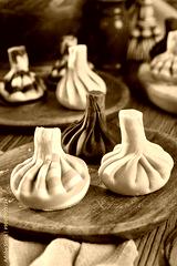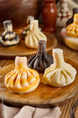 Assorted Khinkali Dumplings Plated on Rustic Wooden Table