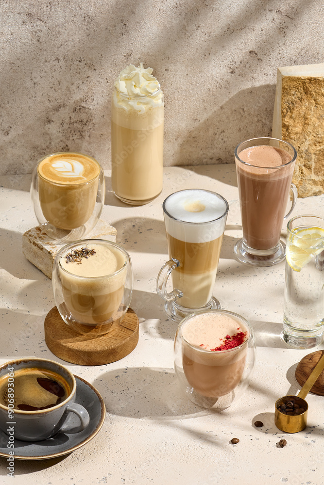 Variety of Coffee Types in a Composition with Latte, Cappuccino, and Iced Coffee