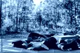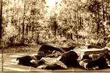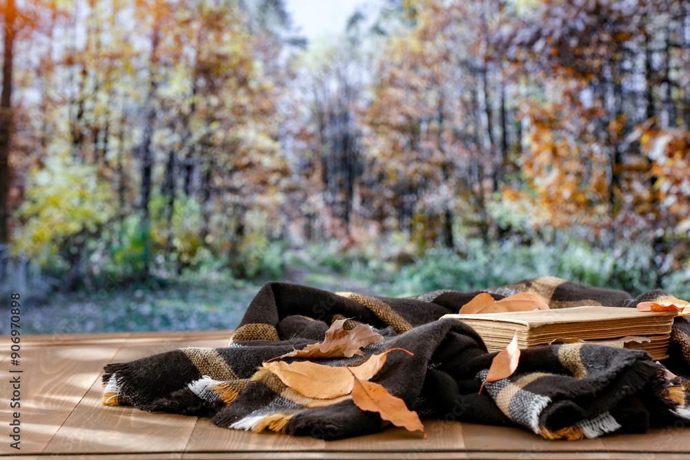 Autumn composition of black blanket and book and autumn tree leaves on wooden table with copy space for products. Autumn season blurred forest landscape background.