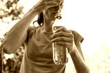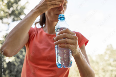 Woman suffers from heat exhaustion in the summer season holding bottle of drinking water