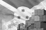 Burundi flag and big stack of shipping cargo containers in docks with sky background close up
