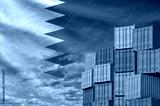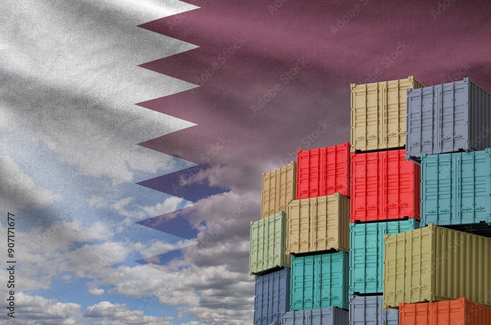 Qatar flag and big stack of shipping cargo containers in docks with sky background close up
