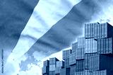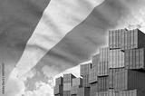 Seychelles flag and big stack of shipping cargo containers in docks with sky background close up