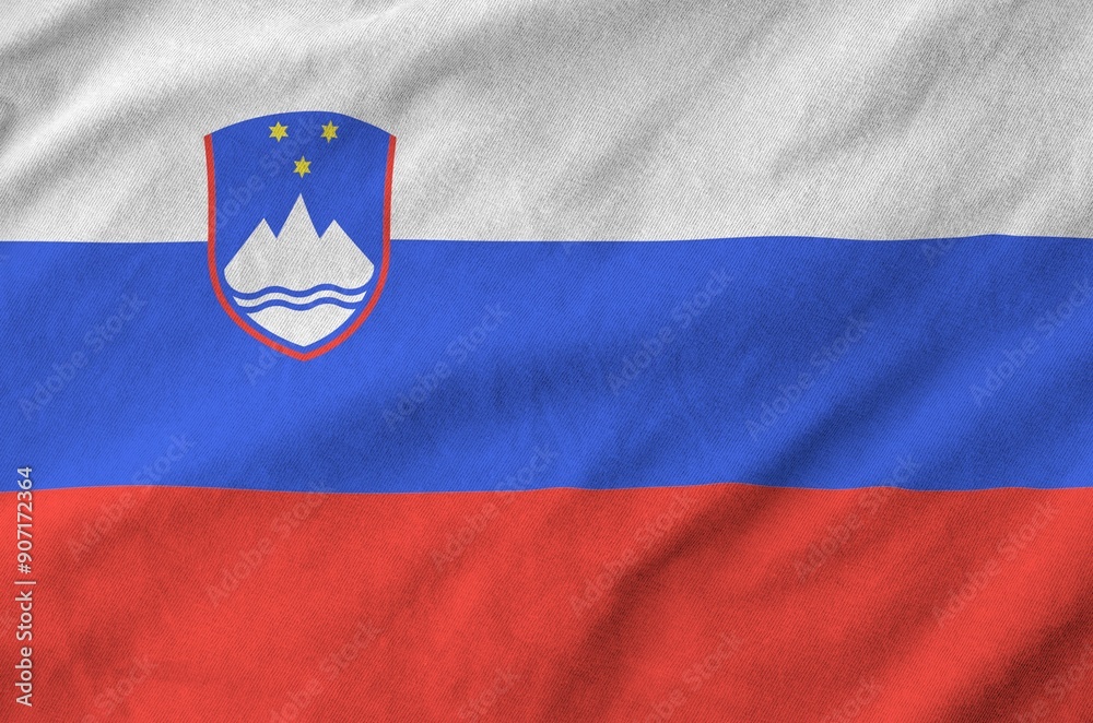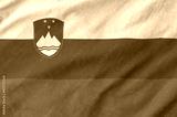 Slovenia flag depicted on folded wavy fabric of old cloth close up