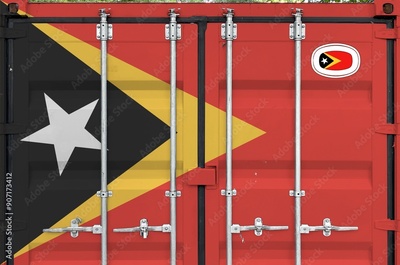 Timor Leste flag depicted on metal doors of shipping cargo container outdoors in docks area close up