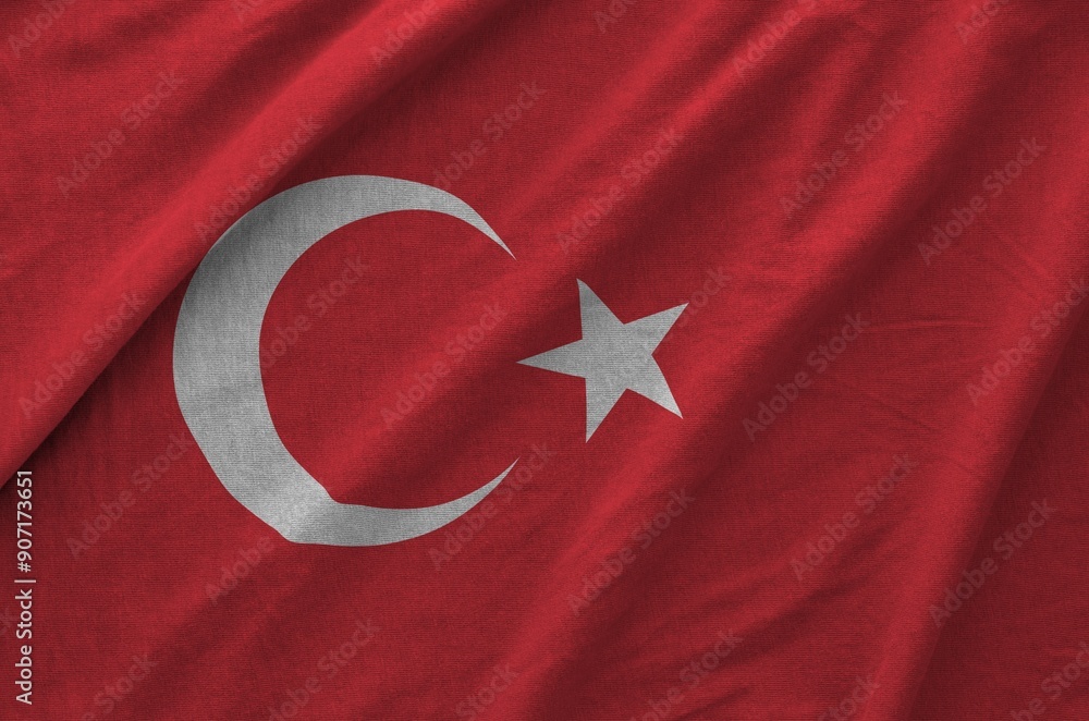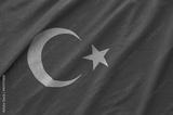 Turkey flag depicted on folded wavy fabric of old cloth close up