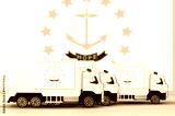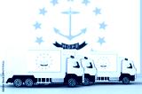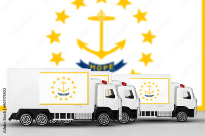 Rhode Island US state flag depicted on side wall of white delivery van close up. Shipping and local delivery concept