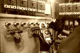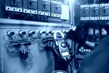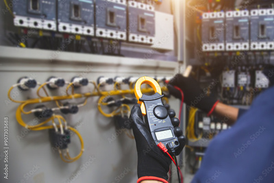 Electrical and electricity service technician checking electric current voltage at circuit breaker terminal and cable wiring in main power distribution board panel for safety maintenance system.