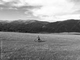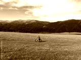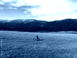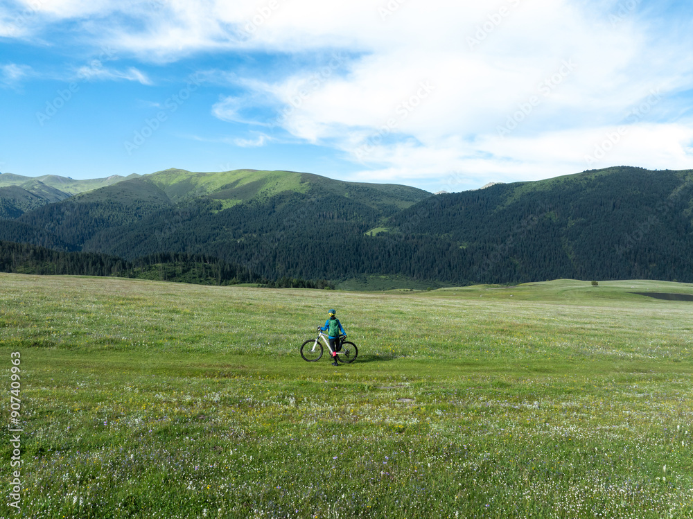 woman riding mountain bike on beautiful flowering grassland mountain top