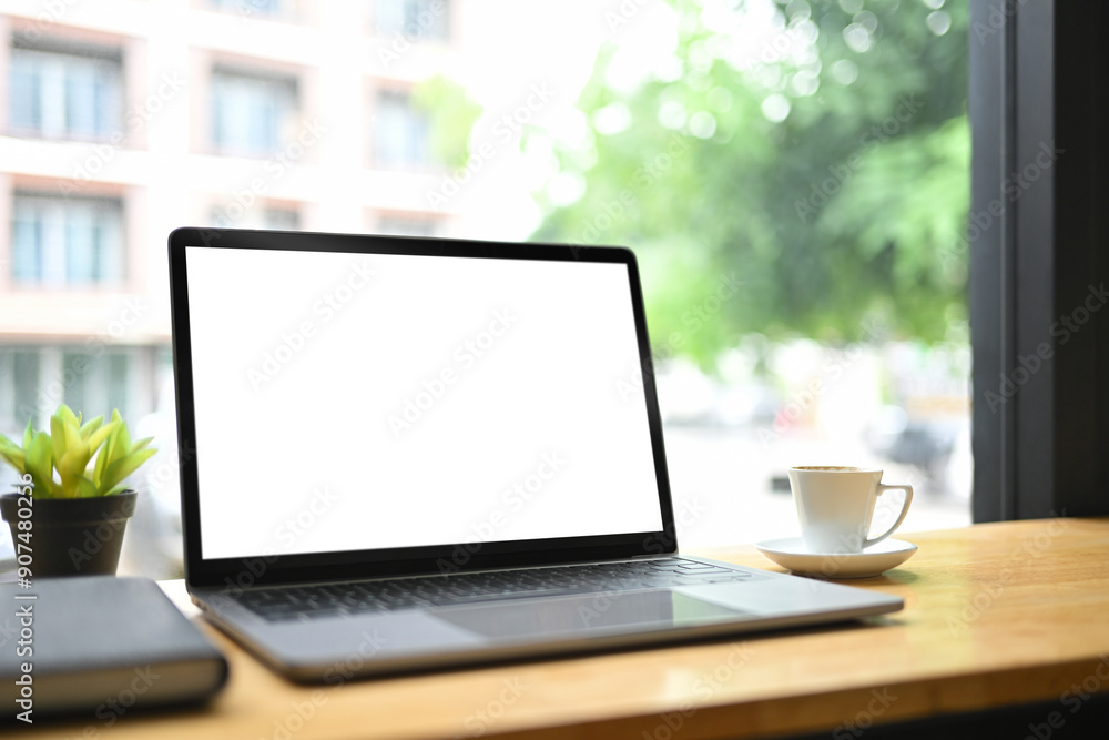 Close up shot of laptop computer with blank screen and cup of coffee on wooden table