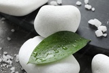 Wet spa stones, sea salt and green leaves on grey surface, closeup