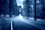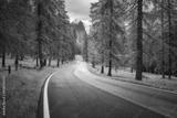 Road in orange forest in autumn. Dolomites, Italy. Beautiful mountain road, trees with lush foliage, grass, high rocks, sky with clouds in fall. Landscape with empty curvy road in the woods. Transport