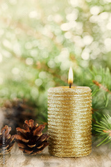 Christmas decorations with lighted candle, pine cones and fir branches on wooden background with magic bokeh effect, Christmas card with copy space for your text or design, selective focus