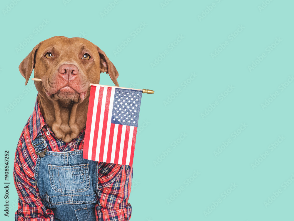 Cute dog, work denim overalls and American Flag. Closeup, indoors. Studio shot. Congratulations for family, loved ones, relatives, friends and colleagues. Pets care concept