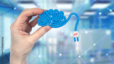 Human brain in hand. Electric wire as metaphor for energy for mind. Taking care of charge for brain. Neurologist recommends brain treatment. Science of neuroscience. Medicine, healthcare