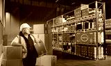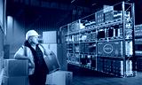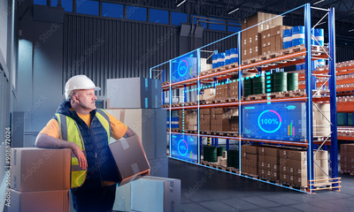 Man warehouse worker. Storekeeper with box. Innovation warehouse manager. Futuristic distribution center. Man in warehouse hangar. Virtual fullness indicators near storage shelves.