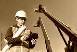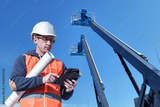 Man foreman. Construction company employee. Construction worker with electronic tablet. Architect in uniform and helmet. Builder stands in open air. Crane booms near engineer. Man builder with gadget